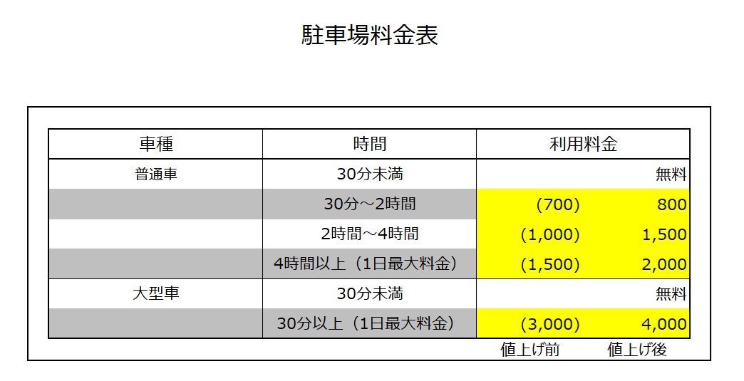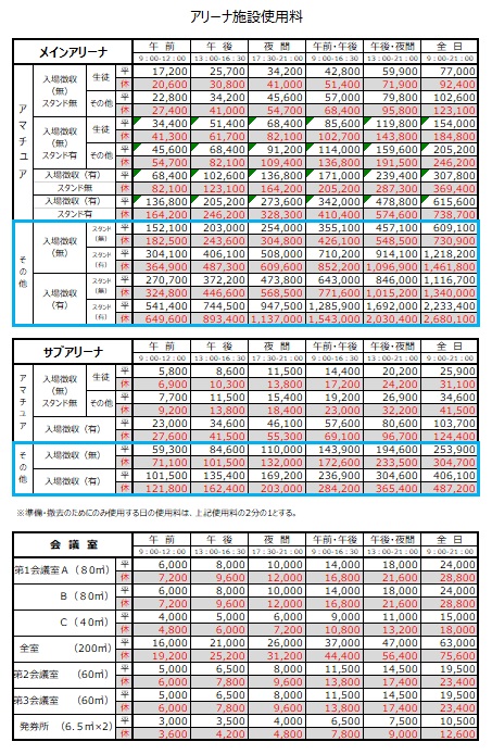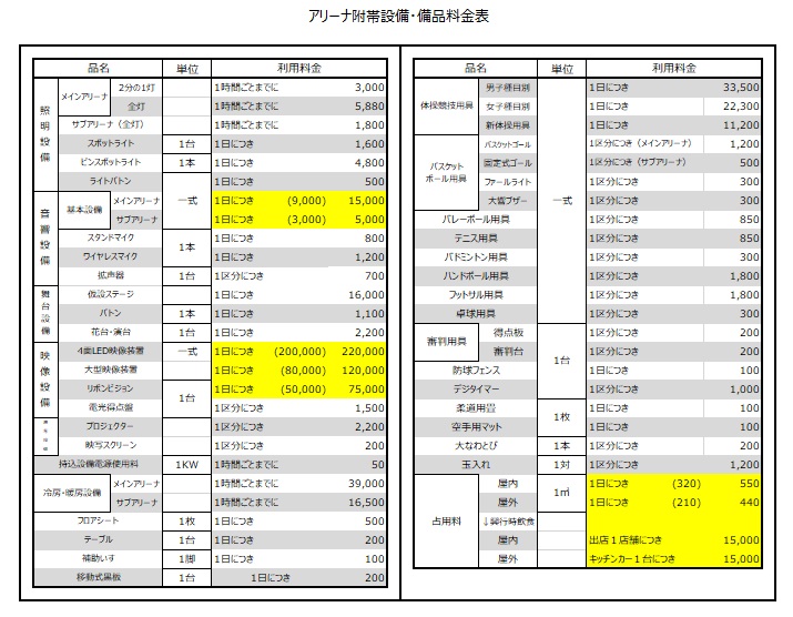 料金改定につきまして(2026年4月1日より改定となります。)〇「アリーナ施設使用料」⇒青枠内「その他料金」区分が改定となります。〇「附帯設備・備品料金」・「駐車場料金」⇒黄色ハイライト箇所が料金改定対象となります。